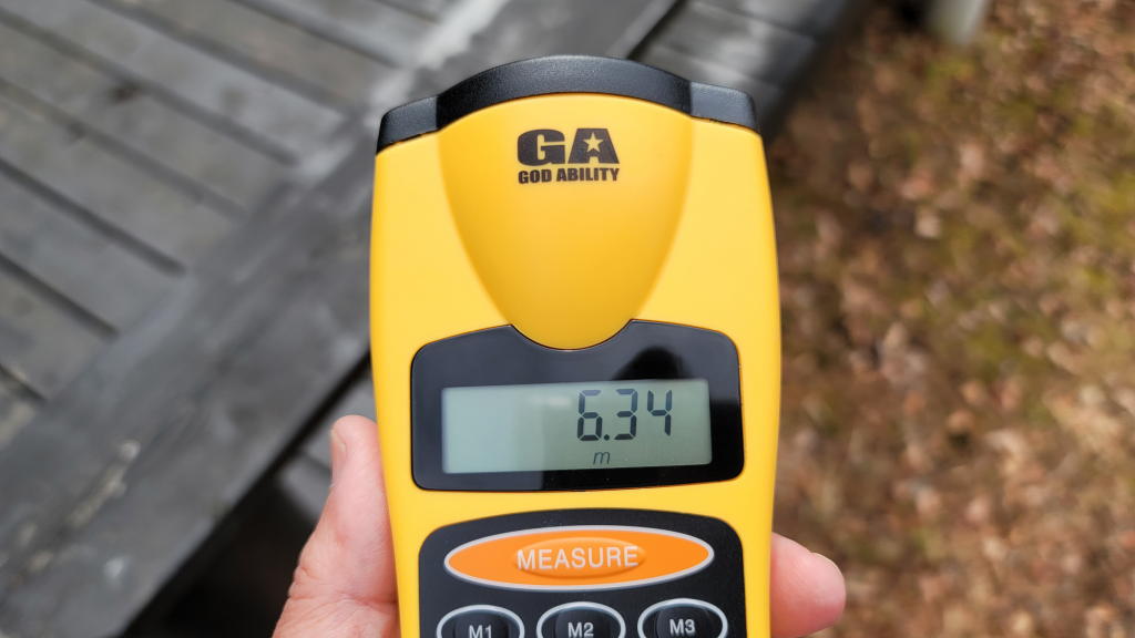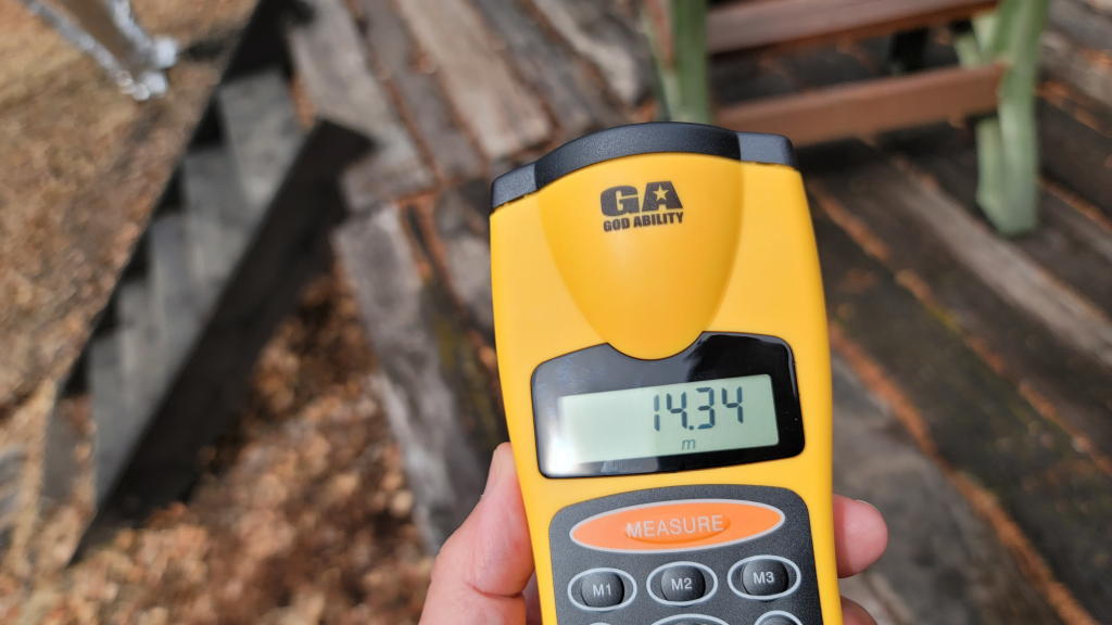 測定距離が20m近くになると精度が落ちる傾向があるので、枕木テラスのコーナーからロフト窓とターゲットのへ距離を測定。