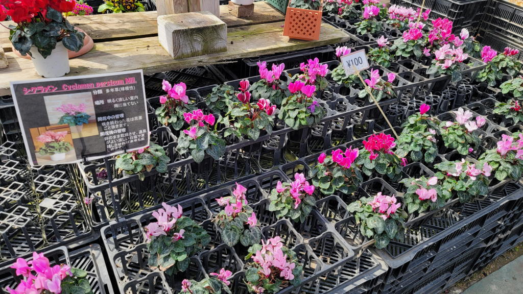 「ガーデンシクラメンが1鉢100円で売っているなんて信じられない!」って社主さまは大喜びして色々と花を買っていた。