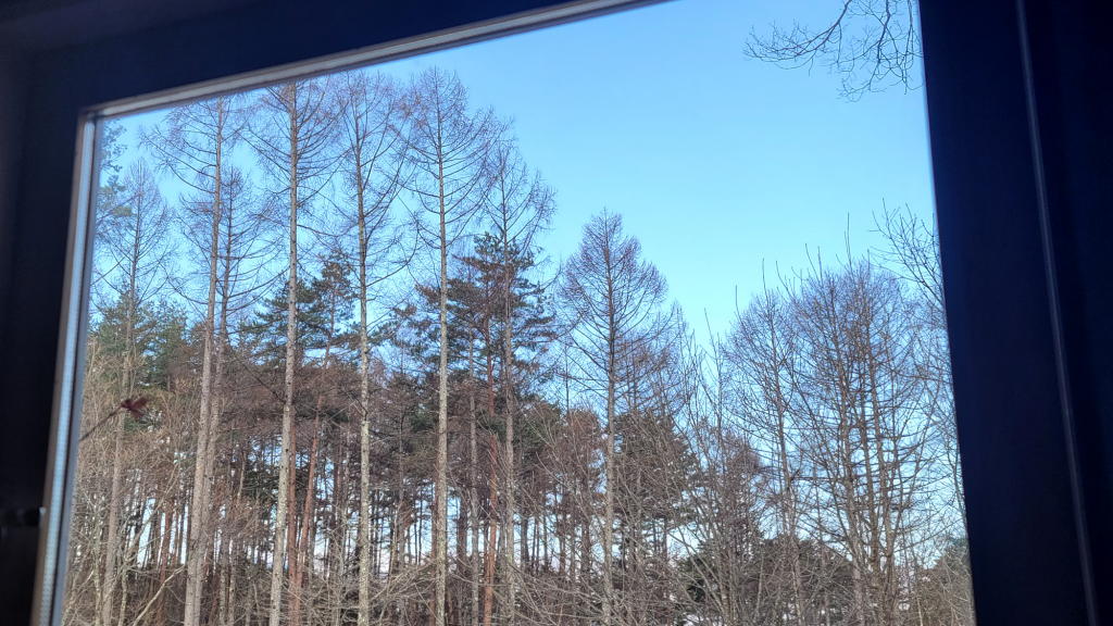昨晩の天気予報で、富士見町界隈は快晴との天気予報だったので、今日の朝は、広葉樹の枝に降り積もった雪が凍って、八ヶ岳ブルーの空の下、朝陽に照らされて光り輝く「青と白の時(https://www.triglav.life/?p=30191)」の到来を期待していたのだ。