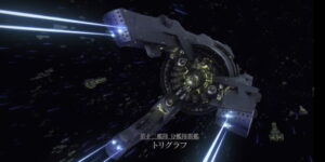 第17話「ヤン艦隊出動」の後半では、Triglavの出撃シーンが登場。おおっ、やっぱり艦形が他の戦艦と全然違って目立つな!