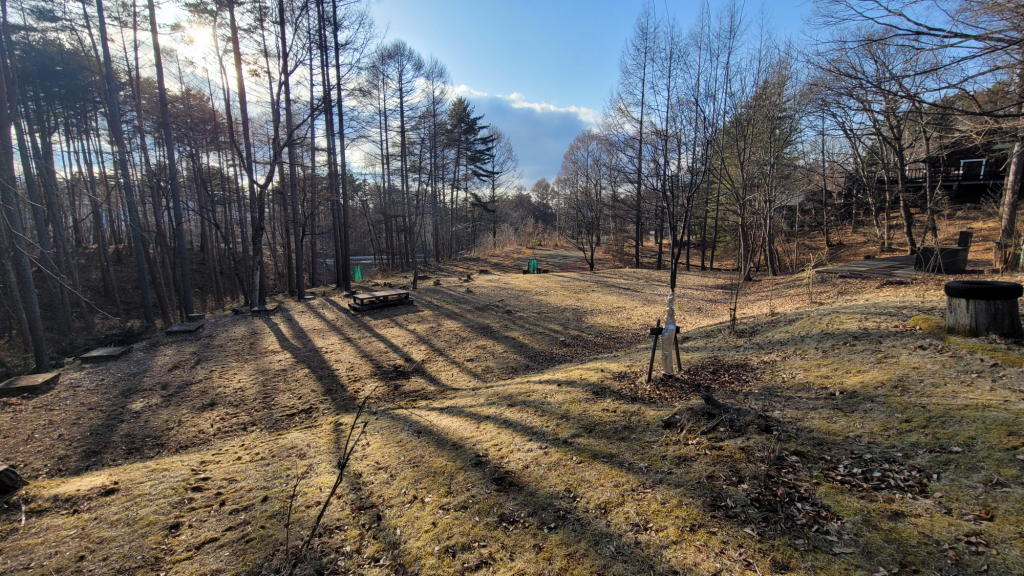 庭に出るとまったく寒さは感じなかった。八ヶ岳ブルーの空は今日も美しく、庭に長く伸びた木々の影はまるでバーコードのようだ。
