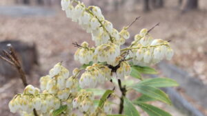 今年の開花トップバッターは何だろうか? おっと、屋久島馬酔木の内の1本が鈴生りの小さな白い花を咲かせているじゃないか。これで決まりだな。