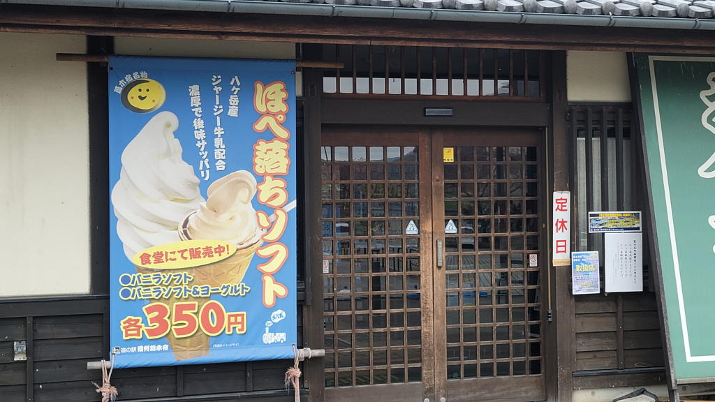 国界のすぐ側には「道の駅 信州蔦木宿」があり、そこでは「ほぺ落ちソフト」を売っている。