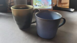 結局、今朝使った「有田焼」と「萩焼」の大型カップを休ませて、「備前焼」と「有田焼」の一回り小さいカップを新たに置く事にした。