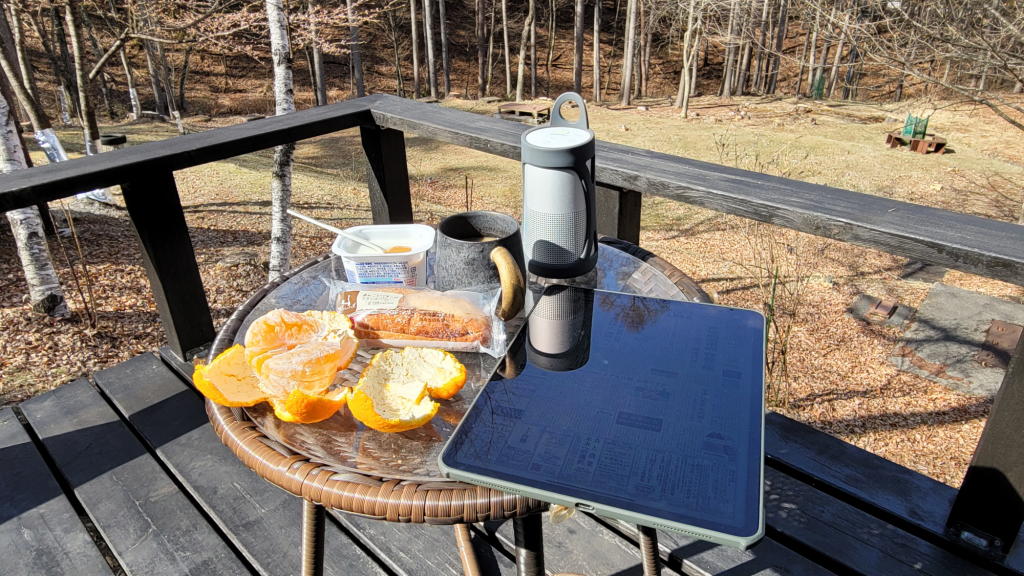 続いて「朝食」。今回の出社でガーデンファニチャーをウッドデッキに出したので、天気の良い日はオフィスのウッドデッキが朝食の場所となる。