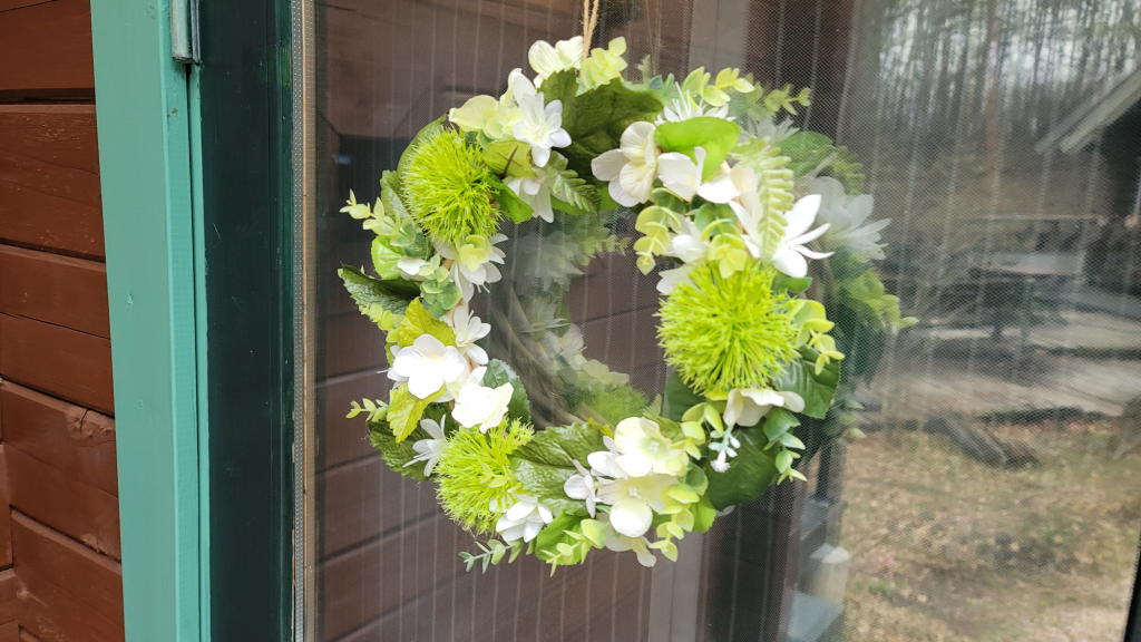 オフィスのドアを飾る社主さまお手製のリースが、新緑モードに変わった。