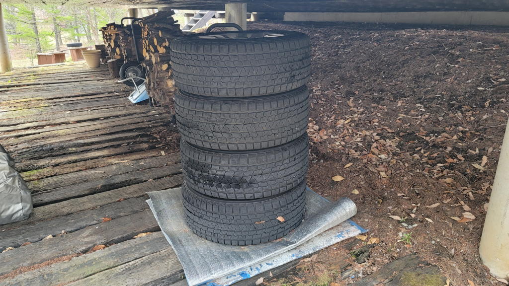 そんな作業を私がしている内に「今日は私も手伝うね。」と言って、社主さま(家内)が、あっと言う間にタイヤを4本、D4のすぐ脇にまで運んできた。