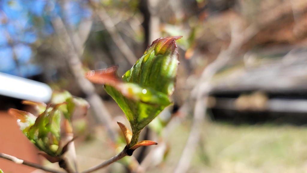 仕方ないので、敷地内の他の木々の新芽を観察(鑑賞)し、GN20Uで写真撮影する。