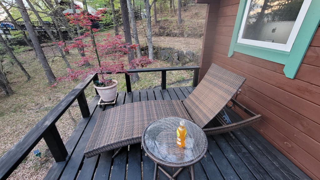 鹿の湯から6時半過ぎに戻って、今日はオフィスウッドデッキに設置したガーデンベッドに寝転がって夕陽を眺めた。
