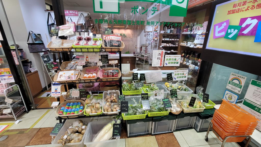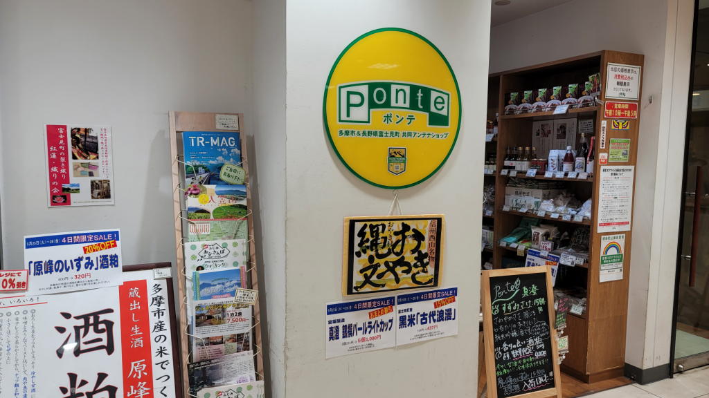 探す必要はまったくなかった。1階の駅に一番近い場所に「Ponte(ポンテ)」と大きなステッカーが貼られた「多摩市と富士見町の共同アンテナショップ」を発見。