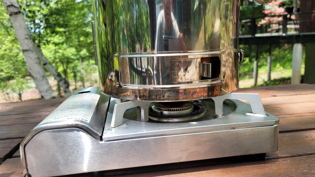 上の穴から煙が出始めた段階で、温度計を見ながらスモーカー内が130~140℃程度になるようにカセットコンロの火の量をこまめに調節(我ながら几帳面だな)。