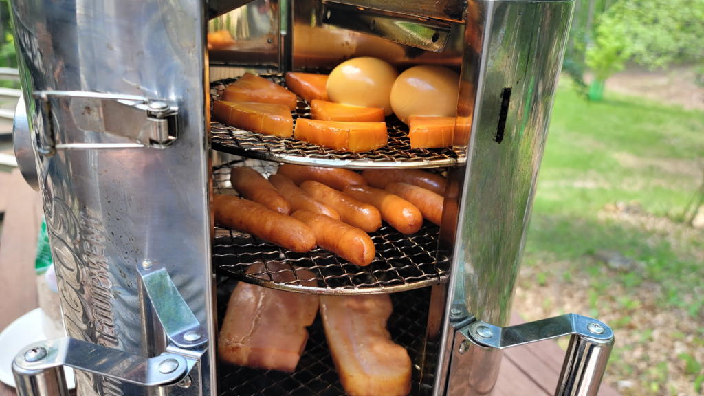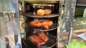 結局、残った部材(ベーコン・ソーセージ・半熟卵)も社主さまの感覚任せでスモーク作業は終了。