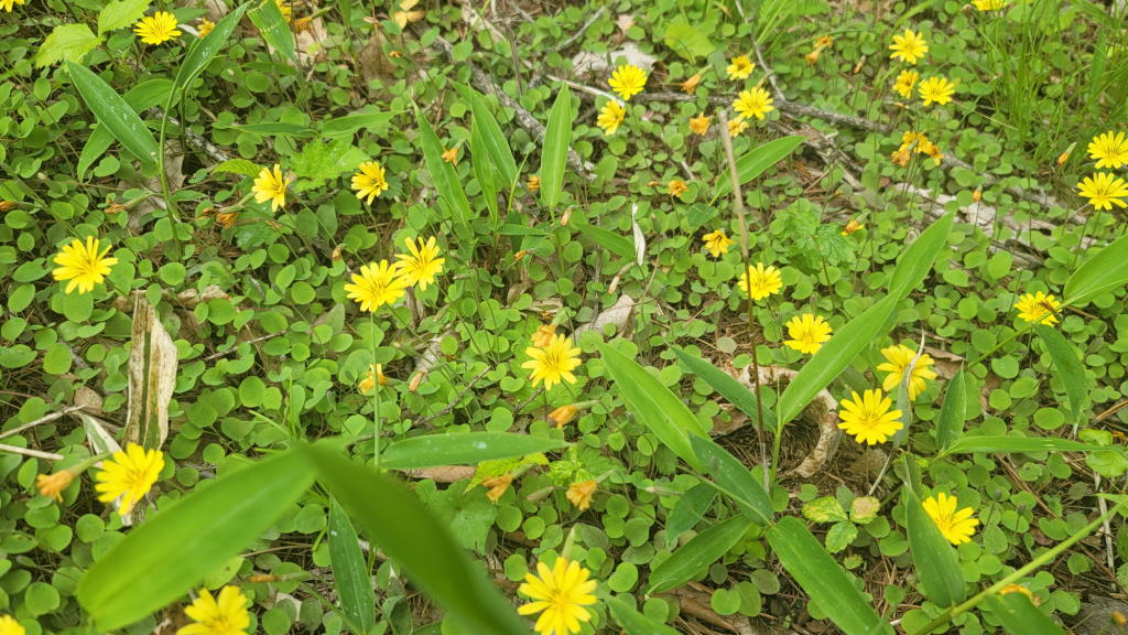 財産区林と我が家の敷地の境界付近では、群生する「マルバウツギ」と「ジシバリ」がやはり一斉に開花。