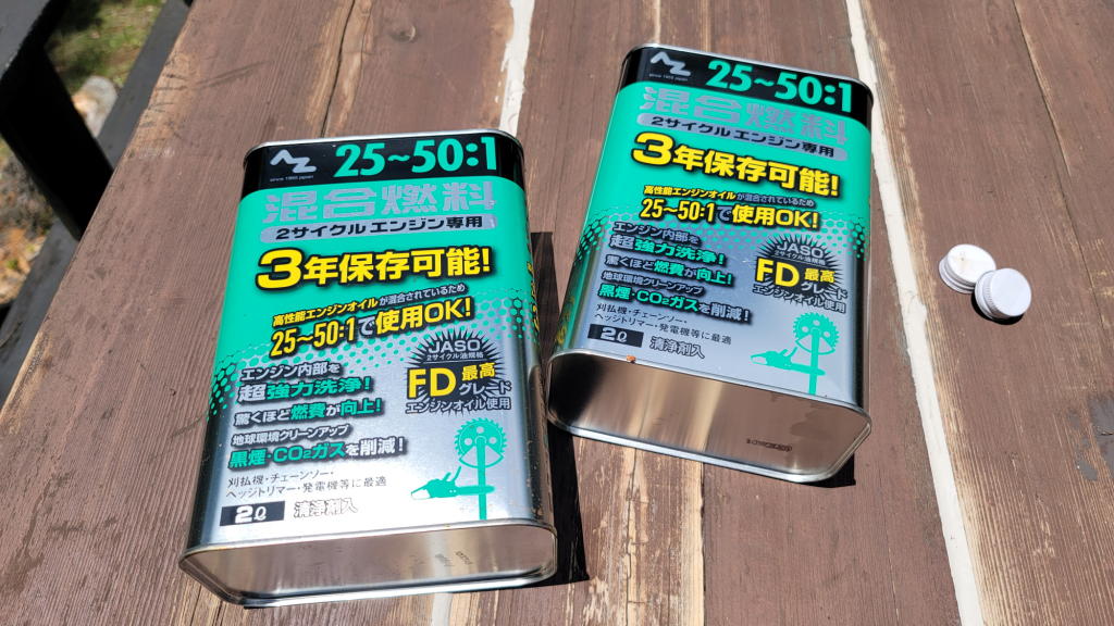 これを「1セット」の作業としてカウントすると、敷地内の芝&草刈り作業を終えるには、ほぼ「10セット」が必要で、混合燃料の2リットル缶がちょうど2缶空になる。