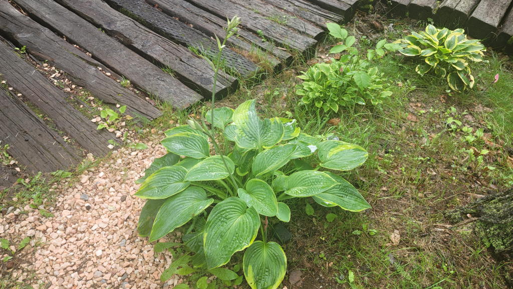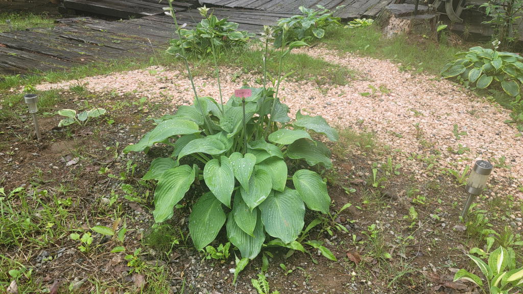 日照不足のせいか、オフィスエントランス周辺のホスタさん達も、蕾の数はどんどん増えているのだがスカッとした開花状態にならない。