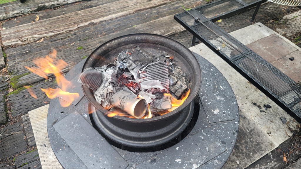 私は基本的には川魚を食べない。社主さまは「ニジマス」が好みなのだが、今日は「ヤマメ」を焼いていた。食材は自分が好きなのを勝手に焼くのがお外BBQルール。1時間程、各々がお気に入りの食材のBBQを楽しんで、最後に使ったペーパー食器を焚き火に放りこんだ。