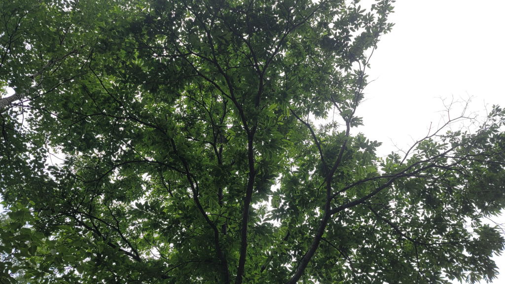 すると社主さまから「白樺と山栗の枝の下のテーブルにBBQ台を移動すれば。枝がドームの役割を果たしてほとんど濡れないんじゃないかしら。」との社命が下った。