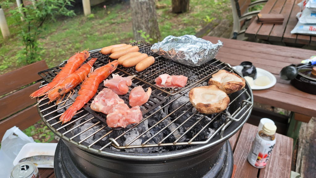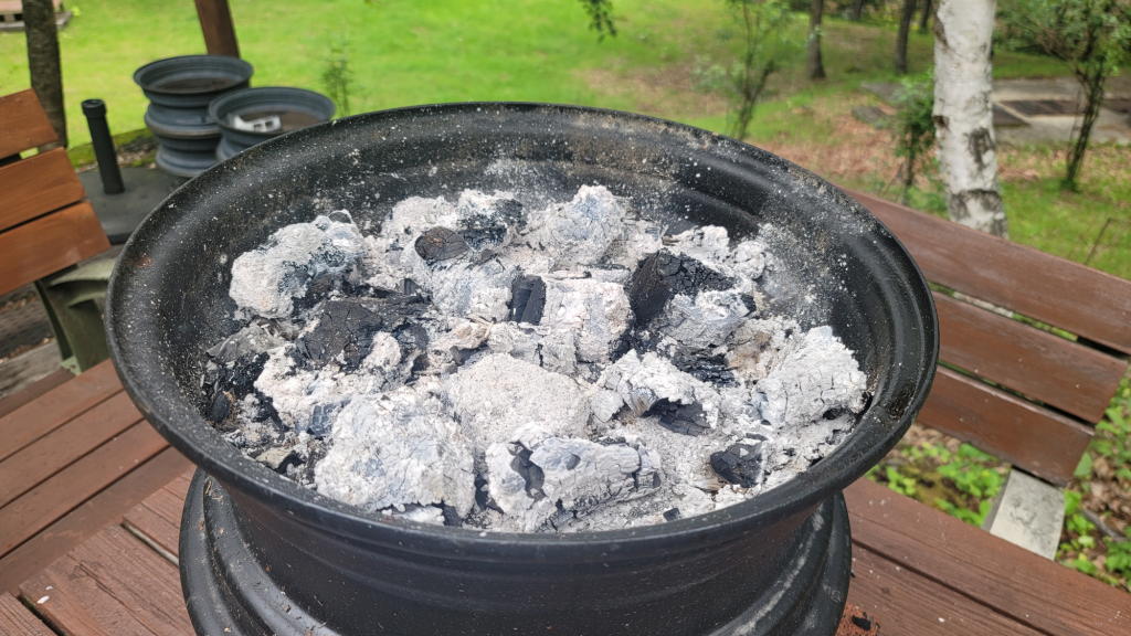続いて、焚き火の中に炭を放り込んでBBQの準備を開始。