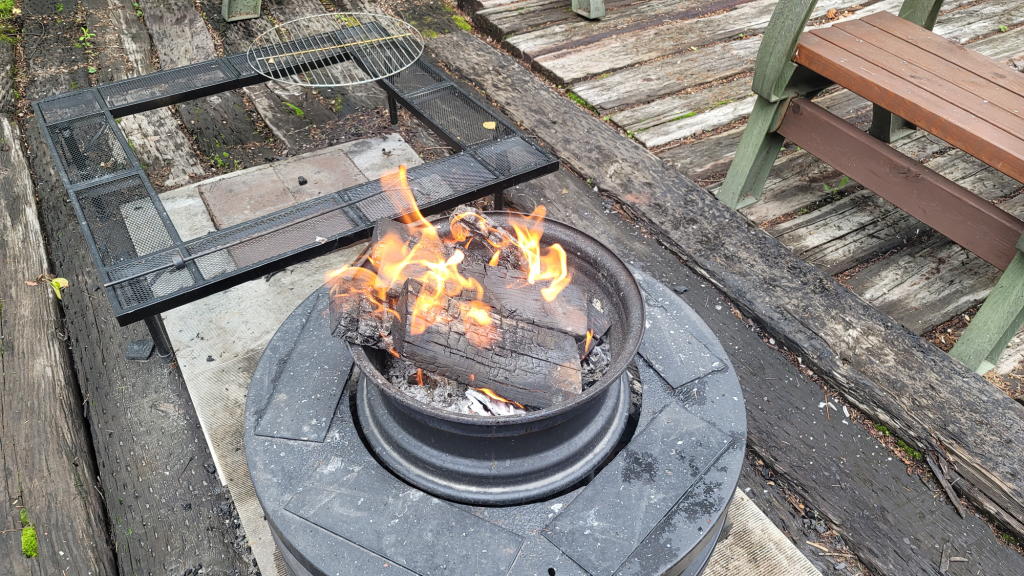 今回の滞在で初の「焚き火」を着火。良く乾燥した部材だけを選んだので、小雨程度には負けない「強い焚き火」が育った。