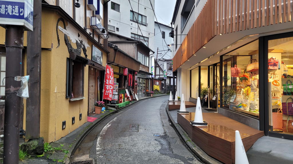 商店通りも人は少ない。雨も降ってきたので、温泉街の散策は早々に切り上げて寺子屋本舗に向かう。