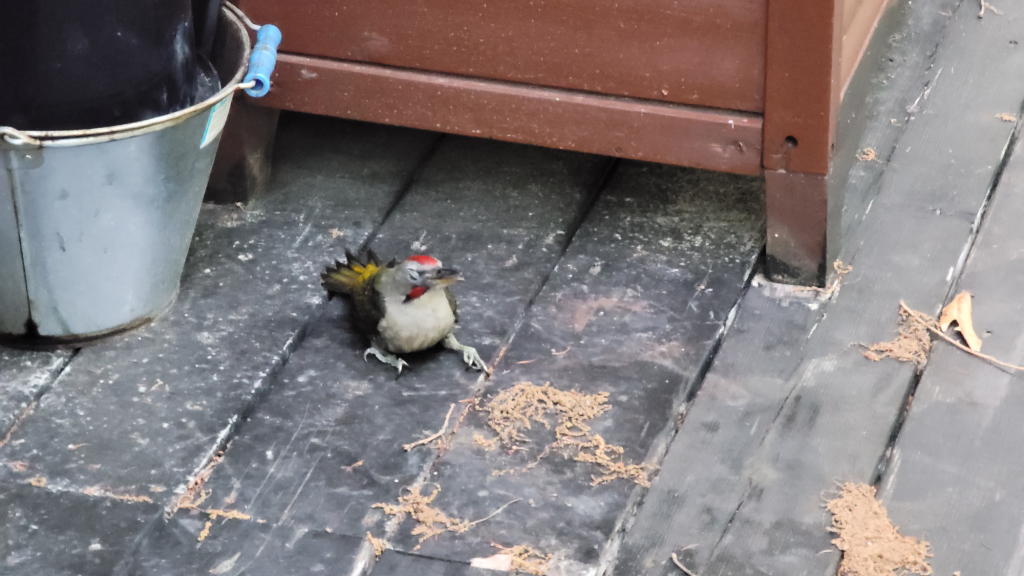 どうやら脳震盪状態となっているようで、飛び立たないでウッドデッキの上で、目を閉じてじっとしていた。
