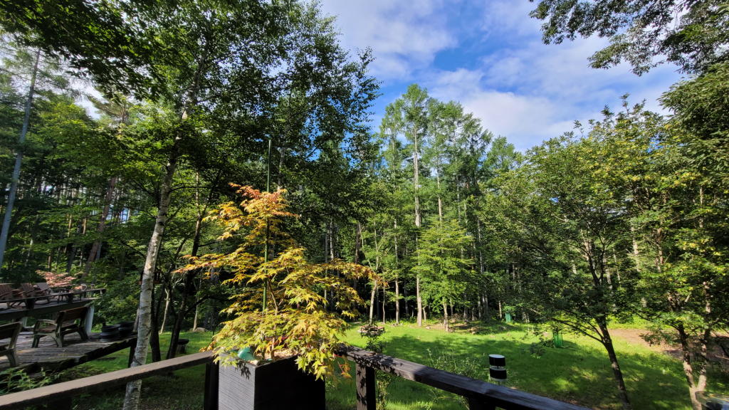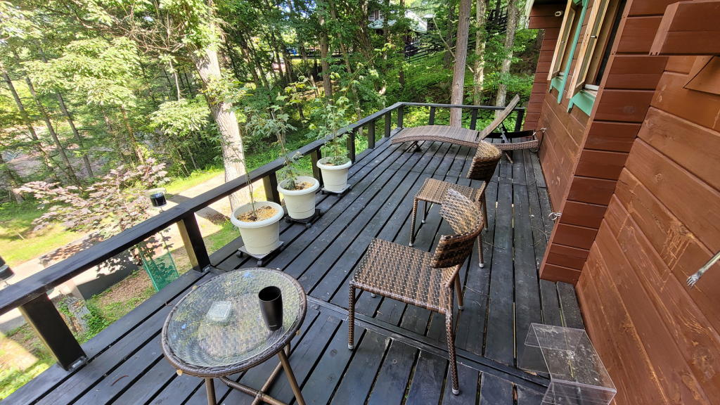 メインウッドデッキとお庭の縁台は、既に朝陽が強く降り注いでいた。こりゃ駄目だな。