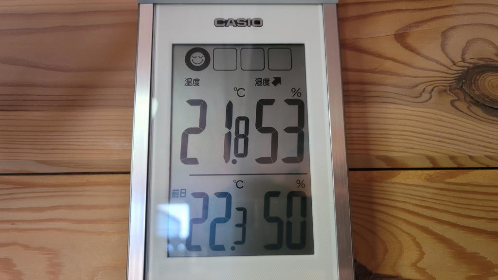 デスクトップPCの真上にある温湿度計が示す室温は21.8℃。ほ~ら、昨日よりも0.5℃低いじゃないか。