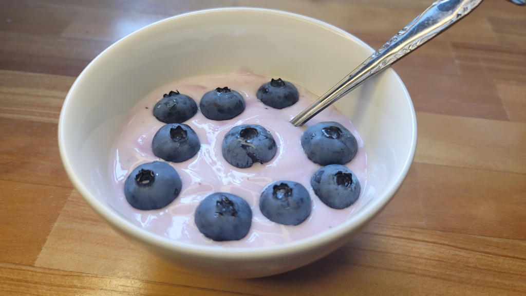 今日のおやつタイムは、ブルーベリーヨーグルトに実を入れて「ブルーベリー尽くし」としよう。