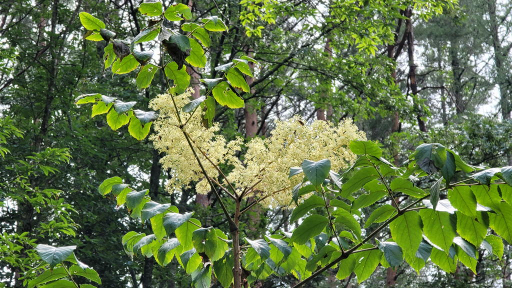 隣接する財産区林内では樹高3mほどある「タラノキ」も開花。