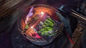 このままでも良いかと思ったが、もうタレを準備してあったので、焚き火の網の上にアルミホイルを敷いて、その上に置いたトウモロコシにタレを掛けた。