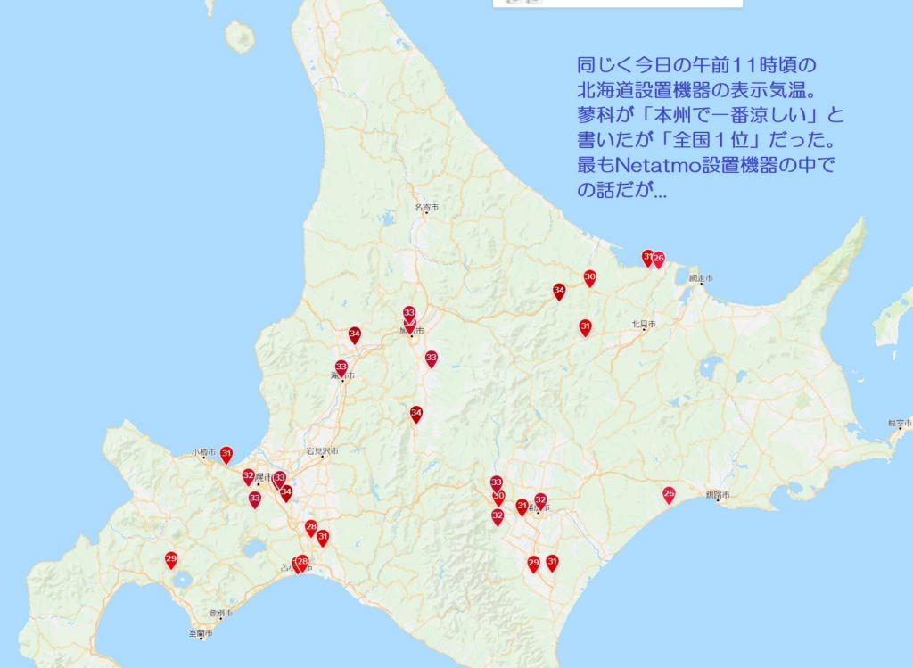 今日の午前11時頃の気温で比較したら、本州ではなく「全国で1位(21℃)・2位(22℃)の涼しさだった」。