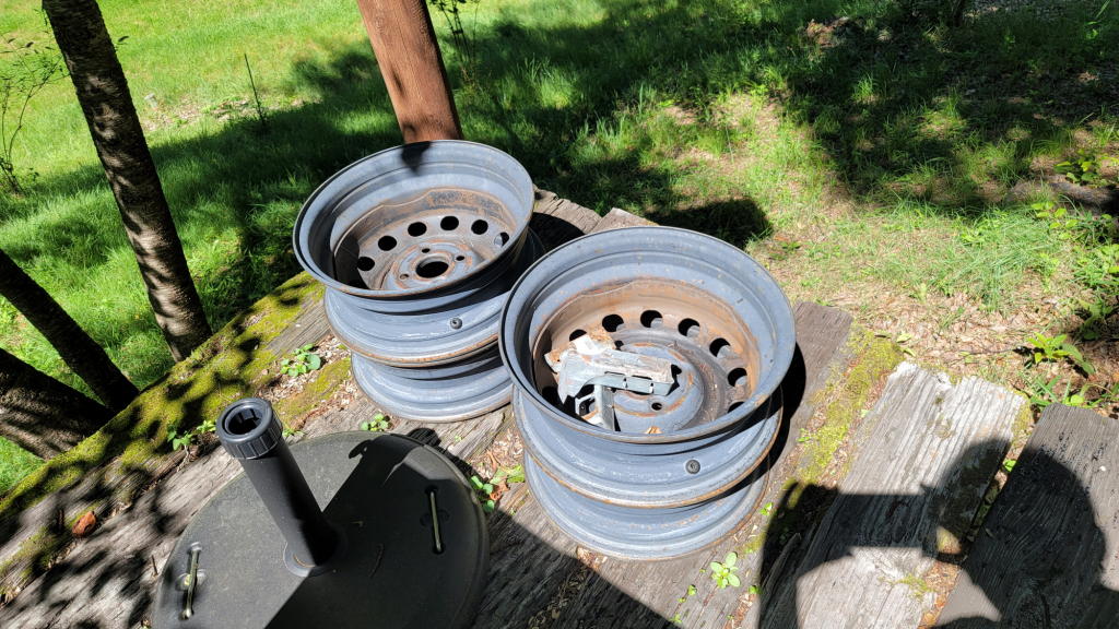 ふと、枕木テラスに置いてある「4個のスチールホイール(鉄チン)」に目が止まった。