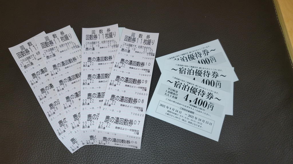 コロナ禍の影響で「鹿の湯通い」が減って、今年の2月23日(富士見の日)に購入したチケットがまだ丸々1セット以上残っていたが、今日も4セット(44回分・2万円)を購入。