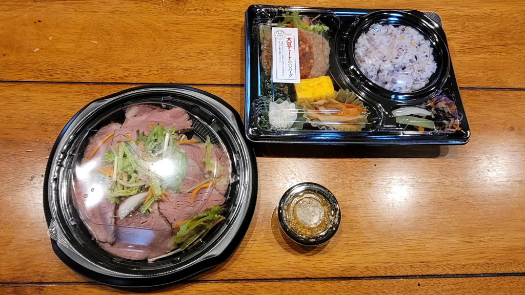 チケット購入のついでにカフェ「モンテチェルボ」に寄って「ローストビーフ弁当」と今日の日替わり弁当(ヘルシー弁当)を購入。