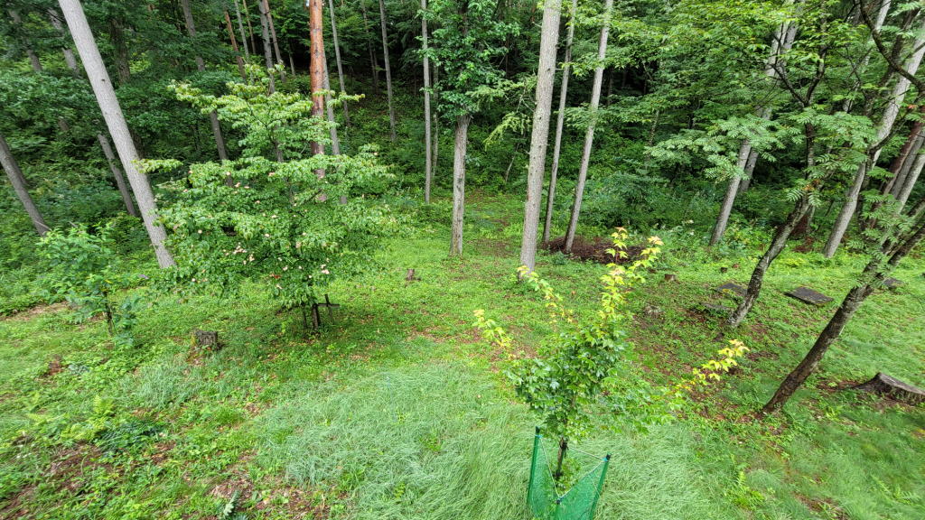 メインウッドデッキから隣接する財産区林を見下ろした。
