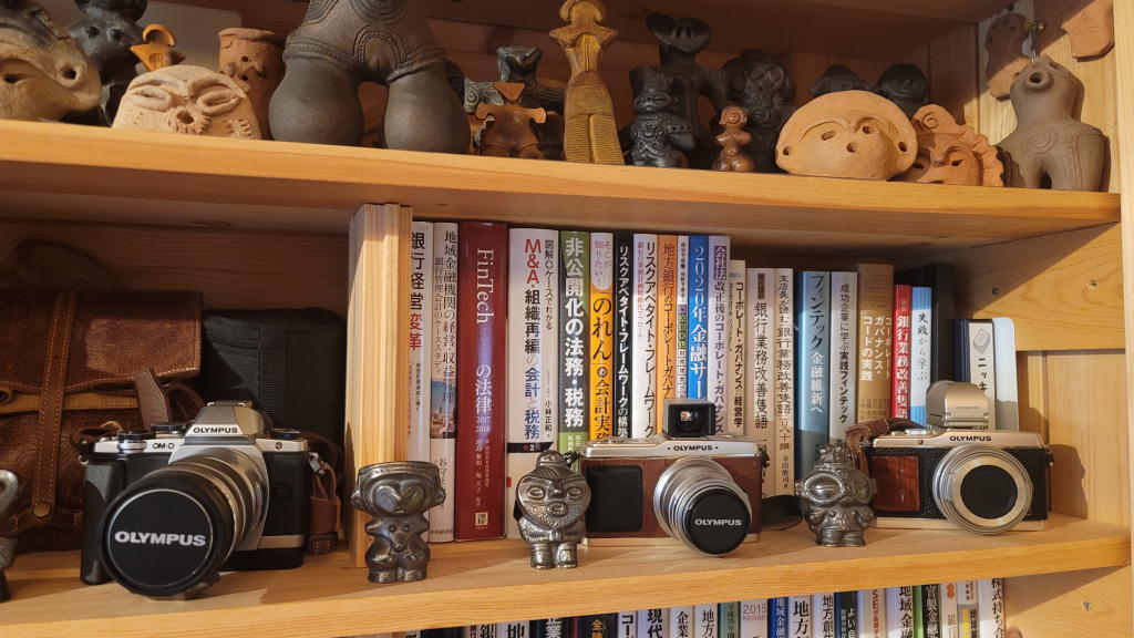 デスク脇の書棚の前に立ったら、土偶さん達のレプリカとOLYMPUSのミラーレス一眼トリオが「たまには私達の事も気にしてよ!」と言っているような気がした。