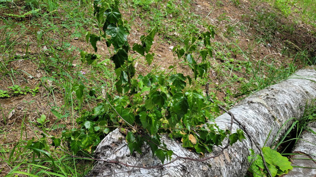 1月に伐採した白樺の根と幹から「萌芽更新」の「蘖(ひこばえ)」が育ち始めているのだ。