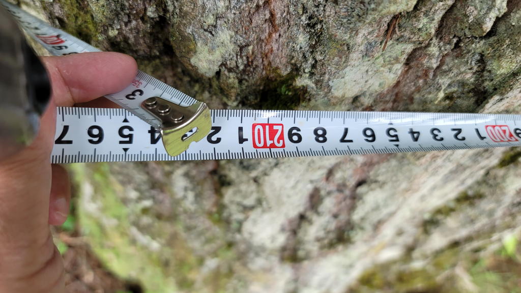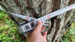 幹回りを計測してみたら、オフィスに近い木は2.3m程度、境界線上の木は2.1m近くあった。