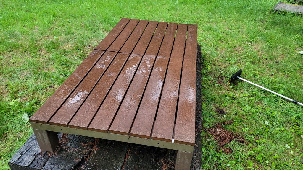 そうだ、「お庭の縁台」がかなり汚れていたな。雨水を利用してデッキブラシと洗剤で掃除しよう!