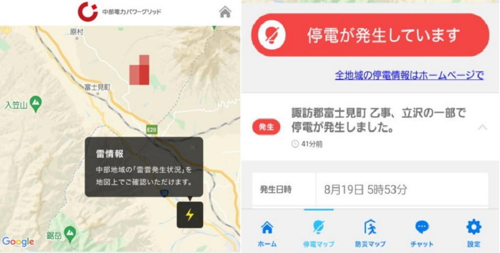 その数分後にアプリを確認すると「停電が発生しています」の表示に変わっていた。