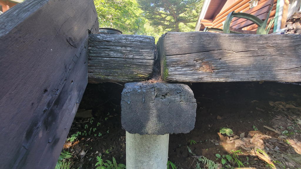 2000年の購入当初は防腐剤(クレオソート)の色がまだ濃かったが、我が家の敷地で直射日光や風雨に晒され、イイ感じに白くなってきている。