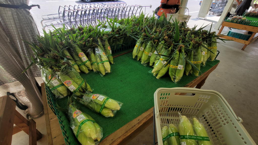 店舗に最も近いスペースにD4を駐車し、開店前に社主さまご用命のトウモロコシの品種をチェック。