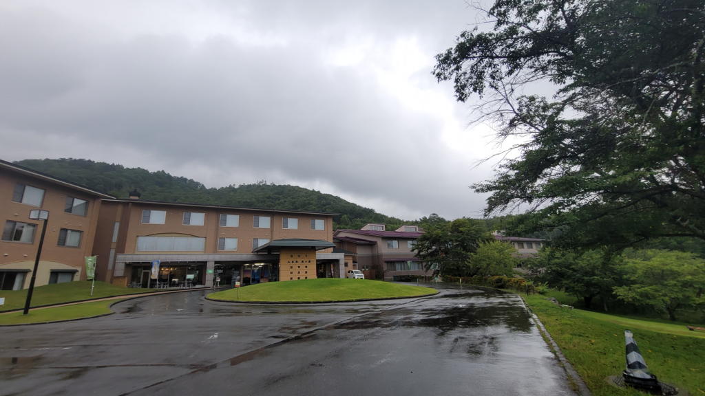途中、JAのATMに立ち寄ったのだが、その頃から土砂降りになり、鹿の湯の駐車場に着いた頃には「滝」のような雨が降っていた。