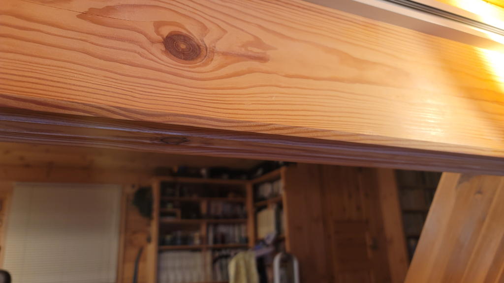 角ログのコーナー部分に全体重を掛けた「頭突き」を噛ましたような感じになった。