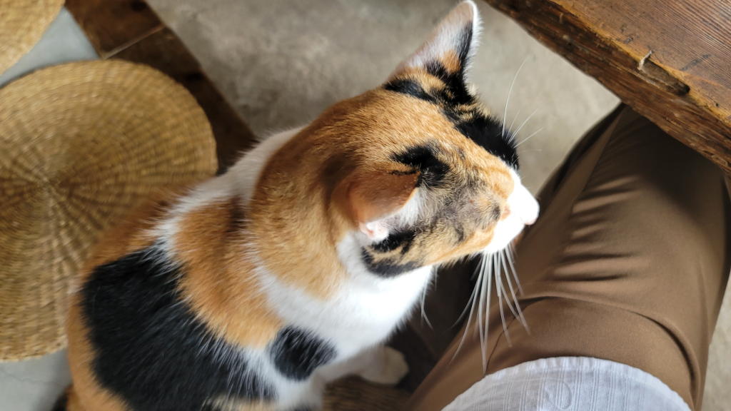 驚いて思わず「ヒエ~」と声を出してしまった。よく見たら「三毛猫」が身体を擦り付けていた。