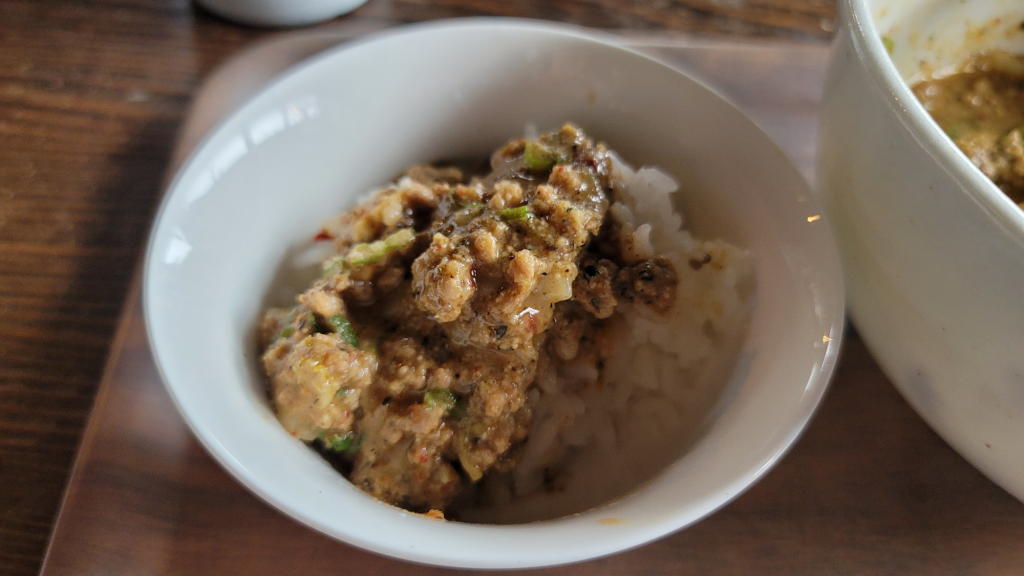 オーナーさんのお奨め通りに、ご飯にうどんの汁と麻辣肉を掛けて食すと、これまた「絶品」。