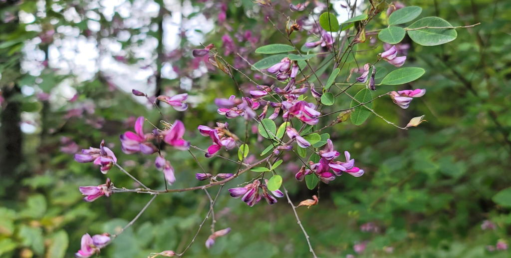 庭を散策していると、ナナカマドの実が真っ赤に色付き、ヤマハギが可憐な紅紫色の花を咲かせ始めたことに気が付く。