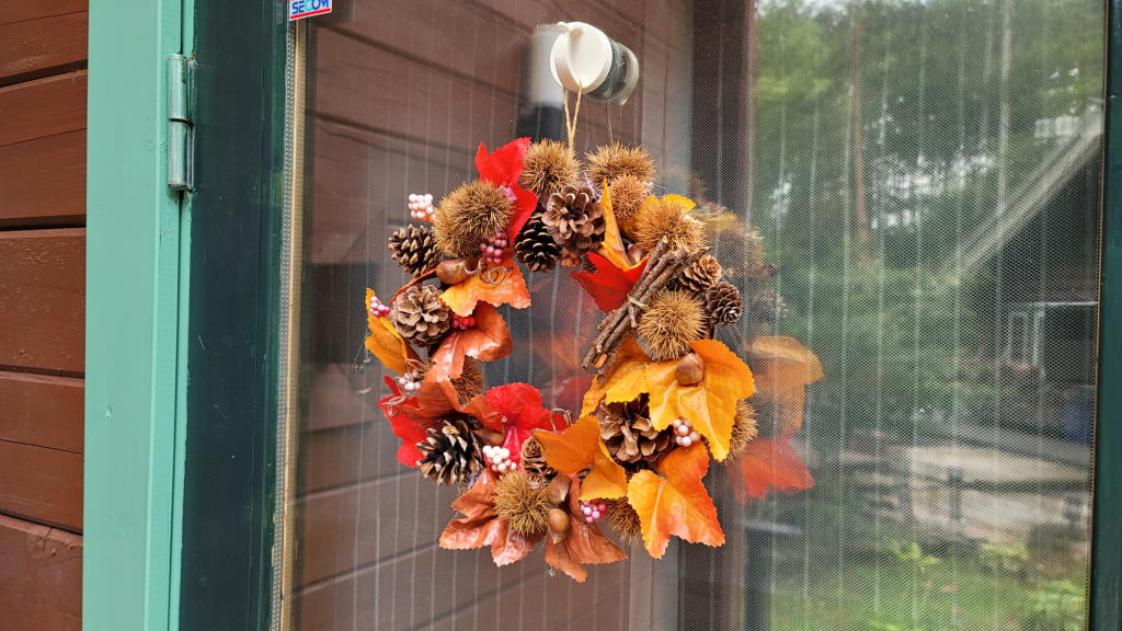 ドアを開けようとしたら、いつの間にか社主さまお手製のリースが「秋バージョン」になっていた。