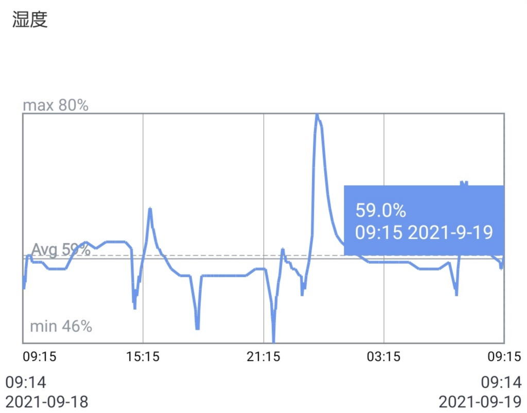 湿度に至っては、最高 80%(エアコンをオフにした後)、最低46%(一時的に除湿運転をした)、平均59%、高低差は34%もあるのだ。