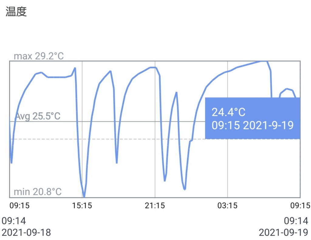 それを示すのが、1日の変化グラフであり、書斎の過去24時間気温の最高は29.2℃、最低が20.8℃、平均25.5℃で、高低差は実に8.4℃。